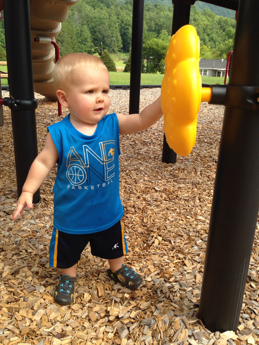 He's been climbing up the steps and going down the slide solo the last couple of months too!